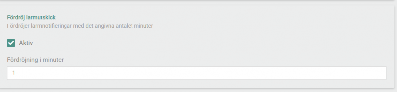 Under fliken ”Utskicksbegränsningar” i larmprofilen aktiveras detta. Kryssa i checkboxen och ange hur många minuter fördröjningen ska vara.