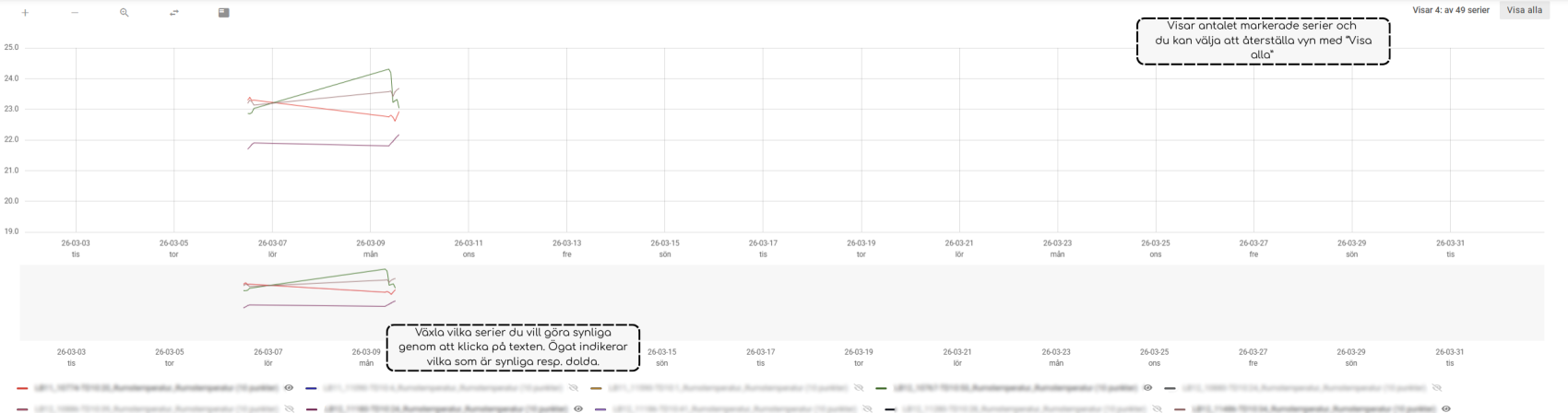 - Om du har flera serier markerade kan du enkelt välja att växla synligheten på dem igen genom att klicka på ”Visa alla” uppe i högra hörnet.